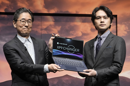 Dynabook株式会社の新ブランドアンバサダーに就任し、覚道清文社長からクリスマスプレゼントにノートパソコンを贈られた北村匠海さん(右)=23日、都内 【時事通信フォト】