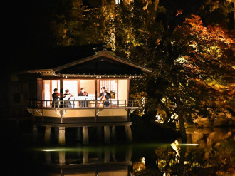 演奏会は霞ケ池に面した内橋亭で、オーケストラ・アンサンブル金沢の原田智子さん、江原千絵さん(以上、バイオリン)、古宮山由里さん(ビオラ)、植木昭雄さん(チェロ)が弦楽四重奏を演奏した。来場者はライトアップされた紅葉を背景に演奏する様子を、池越しに鑑賞した。