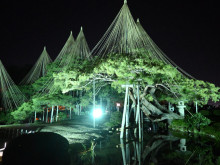 当日、園内は暗闇の中、大勢の来場者が園内の順路に列を成しながら、ライトアップされた唐崎松の雪づりや赤く色づいたモミジ、「徽軫(ことじ)灯籠」を鑑賞したり撮影したりするなど楽しんだ。