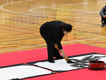 当日は、会場となった体育館の競技場に集まった大勢の観客の前で、翔子さんは畳ほどの大きさの紙2枚に大きな筆で「飛翔」と力強く揮毫した。