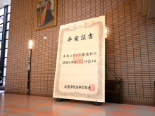 巨大パネルの前では、親子や卒業生同士で記念撮影する姿が見られた。パネルを設置したのは保護者を中心とした育友会。毎年8月に行っている「ミッション祭」のバザーや模擬店での収益を充てた。大きさは横2メートル×縦3メートル。ロールスクリーン状の組み立て式で、実物の卒業証書を忠実に再現した。今後の卒業式などでも活用するという。