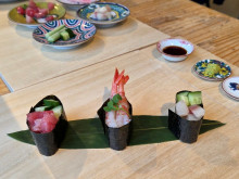 「おにぎり・パン編」は、富山商業高校・情報処理科の18人が「黒とろろむすび」と「わかめむすび」が入った「愛と正義の二つ星セット」(320円)と「大沢野産いちじくのホイップパン」(126円)、同校・流通経済科の25人が富山名産「白エビ」入りのふりかけをかけた「富山むすび」(118円)と富山県産ウインナー使った「頭脳パン」(147円)を考えた。