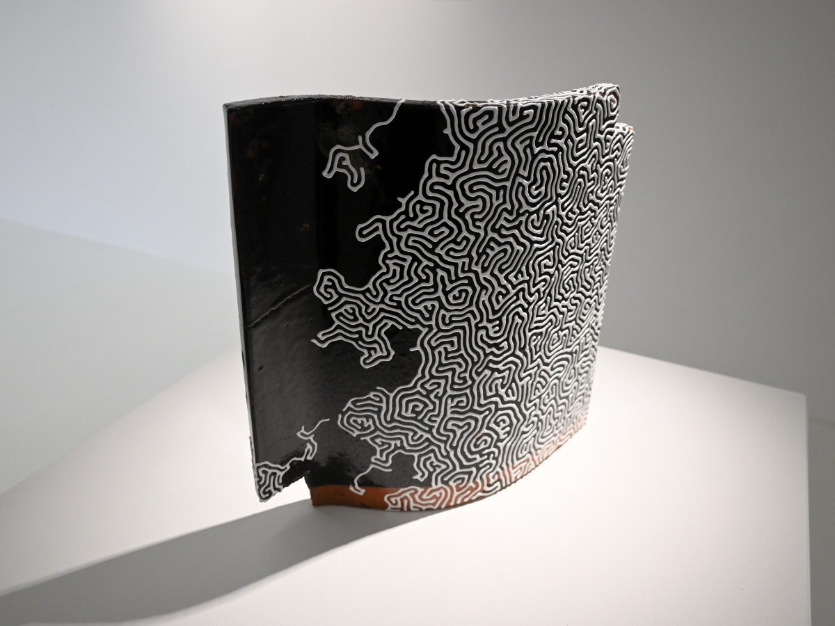 被災地からレスキューした能登瓦に描いた山本基さんの作品「モノクローム 記憶への回廊」