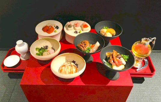 ■メニュー barrierでは、三方(さんぼう)をお膳として利用し、岡持ち(おかもち)に収められた三つのお椀料理に、サイフォンで抽出された一番出汁を注ぎます。 これにより、一杯のお出汁がお客様の食体験に奥深さと芳醇さを加えます。 barrierは、伝統的な日本料理のエッセンスを守りつつも、現代的なアプローチで新たな魅力を引き出すことを目指しています。 漆黒の空間で五感を研ぎ澄ませて、出汁に合う料理をお楽しみください。