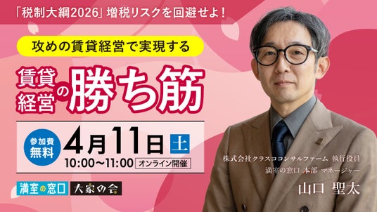 株式会社クラスココンサルファーム(本社:石川県金沢市/代表取締役社長:小村 典弘)は、同社が運営する不動産オーナー向け相談窓口FC「満室の窓口」において、2026年4月11日(土)に、全国の不動産オーナーを対象とした無料オンラインセミナーを開催します。