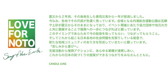 2026年6月末には東京代々木公園での「LOVE FOR NOTO Song of the Earth 2026」開催も決定。一人でも多くの方に能登のリアルを感じて伝えてもらうために。東京、能登それぞれの会場で震災と豪雨災害からの復興過程と能登の今を紹介していきます。