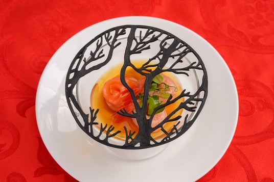 竹炭で仕上げたチュイールでクリスマスムードをいっきに高めるのは、サーモンマリネと金沢甘えびのカクテル。カリフラワームースとコンソメジュレに、自家製のサーモンマリネと、金沢港で水揚げされた甘えびを組み合わせた、華やかなマリアージュをお楽しみください。