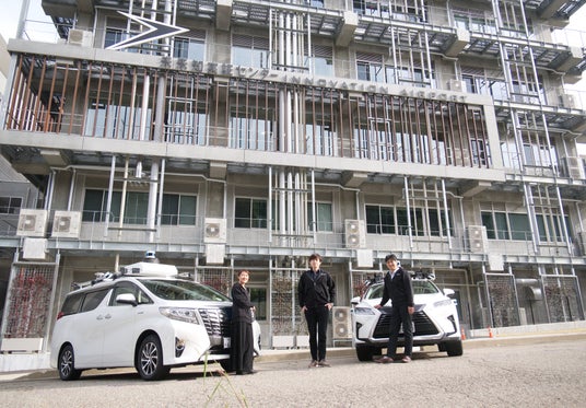 自動運転車両と取締役3名(左から武田、ウェイ、菅沼)