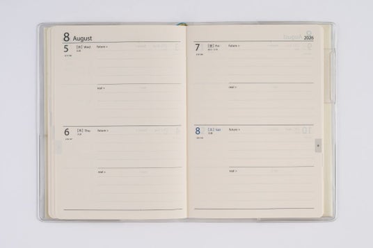 見開きで4日分記入できる記入形式。1日のスペースを「future」と「real」に分けて記入できるようになっています。「future」には、「あした、こんなふうに過ごせたらいいな」というポジティブなできごとを、実際に起こったかのように前日に記入します。「real」には一日の終わりに、実際にあったことを振り返り、日記を書きます。