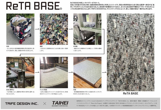 株式会社TRIFE DESIGN(東京都)が運営するアップサイクルブランド/プロジェクト『ReTA BASE』において、アスクル株式会社(東京都)および日本山村硝子株式会社(兵庫県)北辰化成工業株式会社(石川県)が協働パートナーとして参画し、新素材の開発を進めてまいりました。