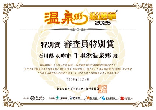 今回、石川県羽咋市に位置する千里浜温泉郷が「美肌部門」第2位(北陸エリア)、さらには特別な貢献を認める「審査員特別賞」をW受賞いたしました。羽咋市と地域が一体となり進めている温泉地の魅力向上や、観光価値を高める取り組みが評価されました。