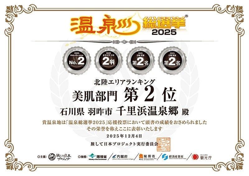 株式会社エムアンドエムサービス(京都府亀岡市、代表取締役社長 小池 悟)が運営する「ちりはま ホテルゆ華」(石川県羽咋市)は、当館が位置する千里浜温泉郷が「温泉総選挙2025」において「美肌部門」第2位(北陸エリア)、ならびに「審査員特別賞」を受賞したことをお知らせします。