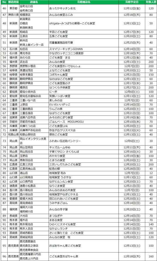 このたびの活動は、社会貢献活動の一環として、店舗周辺の子ども食堂や福祉施設へクリスマスのお菓子を寄贈するものです。寄贈時には、当社従業員が施設を訪問し、施設スタッフ様と協業でクリスマス会等のイベントを開催いたしました。また、寄贈品については、「令和6年能登半島地震」ならびに「令和7年8月熊本豪雨災害」により甚大な被害を受けた石川県、熊本県の菓子製造会社から購入することで、復興支援につなげるとともに、被災地の現状を伝え、支援の輪を風化させることなく全国へ広げていきたいと考えております。