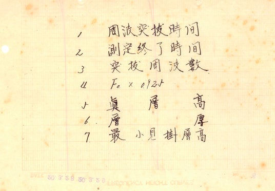 三河地震が発生した1945年1月13日午前3時36分(日本時間)の直前における電離層電子数密度の増加を示す手書きのイオノグラムがあります。これは神奈川県平塚(海軍)が行った垂直観測によるもので、海軍方式のため周波数(横軸)は右から左へ読む必要があります。