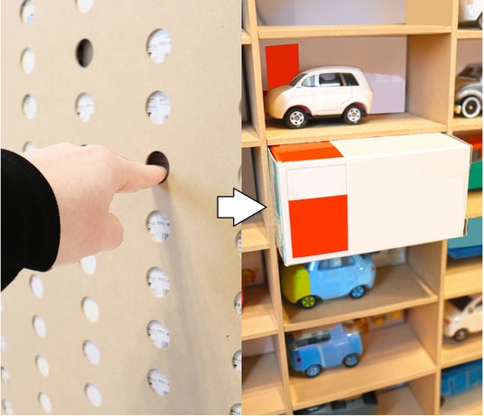 ミニカーの後ろに化粧箱を並べて飾れる設計。