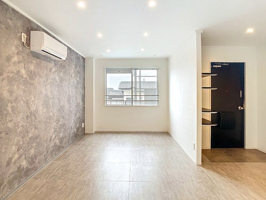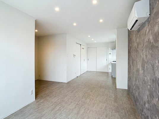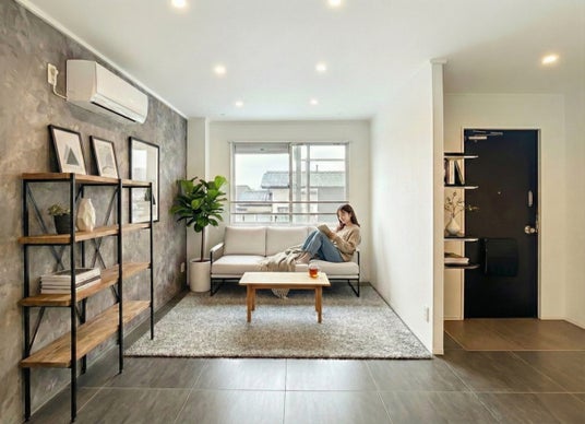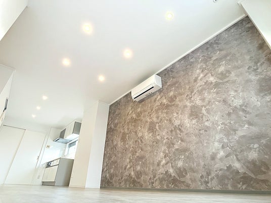 本デザインでは、コンクリート調のアクセントウォールと石目調フロアを採用しています。 無機質で都会的な素材感を取り入れることで、周辺物件との差別化を図ると同時に、住む人の感性や持ち物が映える土台をつくりました。 単なる内装変更ではなく、「自分だけの空間をつくりたい」というニーズに応えるための設計です。