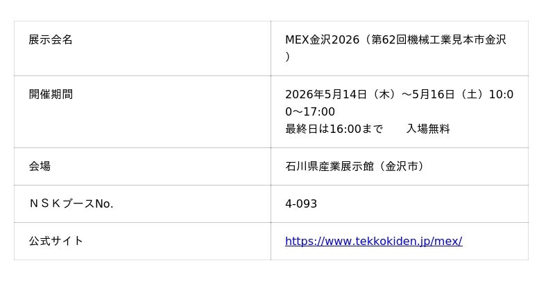 日本精工株式会社(本社:東京都品川区、代表者:取締役 代表執行役社長・CEO 市井 明俊、以下NSK)は2026年5月14日(木)~5月16日(土)に石川県産業展示館(金沢市)で開催される「MEX金沢2026(第62回機械工業見本市金沢)」に出展します。
